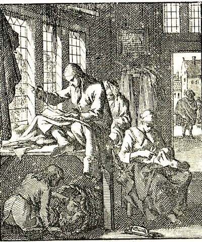 Een schaar, of een hand met een schaar, met als onderschrift: in de vergulde schaer was doorgaans het uithangbord van de meestersnijder. Vanaf midden 17e eeuw zijn er meesterkleermakers die bij de klanten zelf de maat komen nemen.