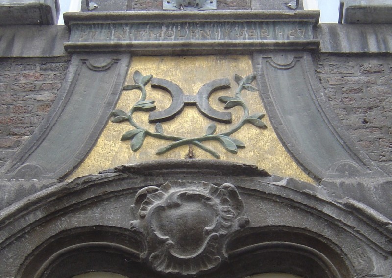 Gevelsteen Muntstraat Maastricht, van een gespecialiseerde smid: hij maakte metalen onderdelen voor molens. Foto Pieter Simons, febr. 2008.