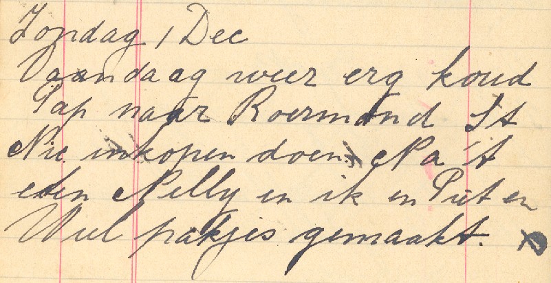 Zondag 1 Dec. Vandaag weer erg koud. Pap naar Roermond St. Nic. inkopen doen. Na 't eten Nelly en ik en Piet en Wiel pakjes gemaakt.