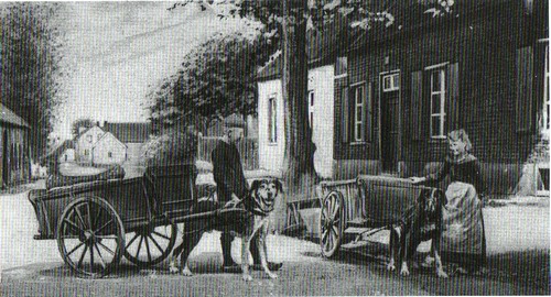 Hondenkarren op de Boutestraat in Swalmen 1908 Woensdag 16 Oct. Vandaag Wiel en ik 370 kg. rogge naar de molen gebracht met de hondenkar van tante Nel. (Stienen Nelke, runde later het beroemde café op de Hei). Pap en Piet met de ..mp (pomp?) aan het huuske aan het werken. De laatste helft van October heeft het hard gevroren.