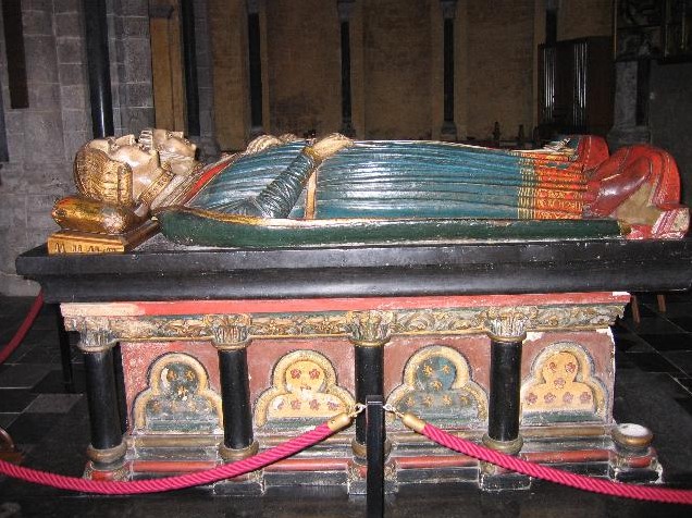 Aan de voeten van de ouders werd het lijk van de onwaardige zoon, Hendrik van Gelre, bijgezet.Hendrik van Gelre was door zijn broer Otto II in samenwerking met Wilem II van Holland in 1247 tot bisschop van Luik gekozen. Hij was een zogenaamde elect-bisschop, d.w.z. dat hij feitelijk alleen het prinsdom Luik bestuurde zonder geestelijke rechten en plichten, zolang hij niet tot priester was gewijd. Voorlopig was hij vooral in vechten geïnteresseerd: hij steunde zijn broer Otto in de strijd tegen Hendrik III van Brabant. In 1258 werd hij alsnog tot priester gewijd, gevolgd door de officële bisschopswijding. In zijn stad Luik, maar ook onder de kapittelheren was hij niet geliefd. Toen hij door de aartsdiaken gewezen werd op zijn dubieuze levenswandel schopte Hendrik de tachtigjarige onderuit. Toen was iedereen zo boos dat Hendrik moest vluchten. Op het concilie van Lyon van 1274 werd Hendrik van Gelre afgezet. Op het kasteel van Montfort waar hij toen ging wonen gedroeg hij zich als een tiran en roofridder voor de hele omgeving. In 1277 werd hij zelfs vogelvrij verklaard. De laatste jaren van zijn leven zwierf hij vaak met zijn legertje in de omgeving van Luik. In 1281 vermoordde hij in de omgeving van Tienen bisschop Enghanius. In 1284 werd hij dan zelf in een gevecht gedood.