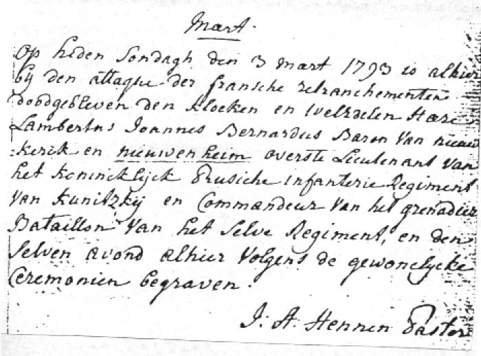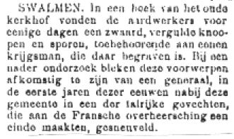 In 1896 werd het oude kerkhof bij de kerk opgeruimd. Enkele grondwerkers vonden toen een zwaard, enkele vergulde knopen en sporen, die hoogstwaarschijnlijk in verband kunnen worden gebracht met een Franse generaal, maar misschien ook hebben toebehoord aan luitenant kolonel von Nievenheim. In de Maas- en Roerbode van 2 mei 1896 hierover een kort berichtje.
