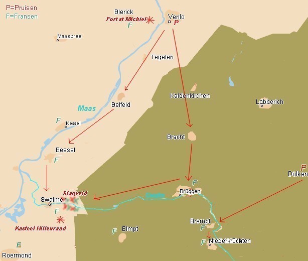 Nadat in december 1792 Roermond en omgeving was ingenomen door het oprukkende Franse leger, kwam het daarna snel tot stilstand, mede dankzij de winter. De Franse soldaten hadden niet voldoende kleren en schoeisel, de infanterie had veel te weinig geweren, een deel der ruiterij had geen zadels of tuigen, de wagens en artillerie waren zonder bespanningen. De hoofdmacht betrok toen winterkwartieren op de linkermaasoever. De inwoners van de bezette plaatsen moesten de Fransen onderhouden. In Wezel werd het Oostenrijkse en Pruisische leger samengetrokken om te trachten de Franse opmars te stoppen. Het Pruisische legerkorps was toen 11000 man sterk en bestond uit 4 infanterieregimenten. Daarnaast waren er twee regimenten cavalerie (samen ongeveer 2000 ruiters), 1 bataljon (700 soldaten) huzaren en twee compagnieën jagers. Op 1 februari verklaarde Frankrijk ook de oorlog aan de Republiek Nederland en aan Engeland. Venlo was een versterkte vesting van de Republiek Nederland, deze wilden de Fransen nu gaan veroveren. Op 8 februari bezetten ze Kessel en Blerick. De Pruisen besloten de Fransen voor te zijn en werden op 11 februari de stad binnengelaten. Nog geen uur later veroverden de Fransen fort Michiel aan de andere kant van de Maas. De Maas stond toen buitengewoon hoog. Na enkele kanonschoten vanuit dit fort beantwoorden de Pruisen het vuur vanuit Venlo. Intussen werd er door de Fransen een linie gemaakt bij Swalmen. 600-800 soldaten moesten het dorp verdedigen en aan de Zuidzijde van de Swalm werden enkele schansen opgeworpen. In Beesel werden ook enkele vooruitgeschoven posities ingenomen. Verder werden er soldaten gelegerd in Niederkrüchten (1200-1500 man), Elmpt en Brempt (enkele honderden soldaten). Ook Brüggen was bezet met een bezettingsmacht van 1200-1500 soldaten. Op 13 -16 februari werd de troepenmacht in Beesel versterkt tot 275 a 300 soldaten, waaronder 50 ruiters. Inmiddels hadden ook de Oostenrijkers versterkingen gekregen, hun leger bestond inmiddels uit 40000 man. Zij kregen de opdracht om Roermond te omsingelen. Dit leger onder leiding van de prins van Coburg trok bij Düren de Roer over, generaal Clerfayt trok bij Jülich de Roer over en bij Aldenhoven werd de Franse generaal Valence met grote verliezen verslagen. De volgende stap zou het veroveren van Roermond zijn. Eerst wilde men de Fransen verdrijven uit de stellingen in de omgeving. De eerste kolonne van de Pruisen o.l.v. von Knobelsdorff zou via Belfeld en Beesel naar Swalmen trekken, om daar de brug over de Swalm te veroveren. De tweede kolonne o.l.v. generaal majoor Von der Goltz en generaal-majoor Kunitzky zou via Bracht Brüggen veroveren en dan eveneens naar Swalmen trekken. De bedoeling was dat een deel dat via de zuidelijke oever zou doen om de Fransen ook van daaruit te kunnen aanvallen. De derde kolonne o.l.v. Generaal-Luitenant von Reppert en generaal-Majoor von Köthen zou vanuit Dülken Niederkrüchten veroveren. Andere kolonnes richtten zich op Arsbeck en Wassenberg.