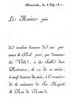 "Maastricht, 1 juni 1811. De maire nodigt... uit met zijn vertegenwoordiging het galabal te vieren, dat de stad geeft in de redoutezaal op de tiende van deze maand om negen uur 's avonds ter gelegenheid van de geboorte van zijne majesteit de koning van Rome."