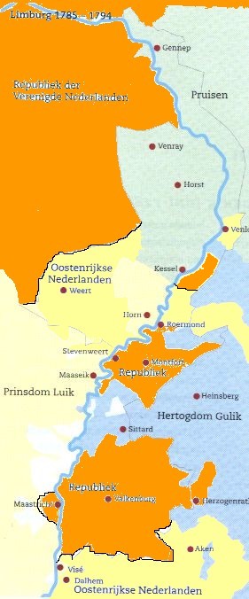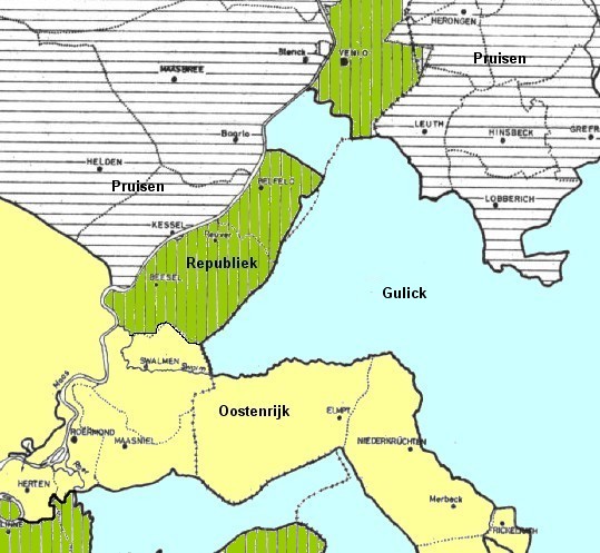 Deze indeling bleef tot de Franse tijd aan het eind van de eeuw gehandhaafd. Opvallend is dus de aparte status van Belfeld en Beesel, maar ook hoe het aangrenzende Duitse gebied van Roermond en Swalmen onder hetzelfde (Oostenrijkse) bestuur valt. Maastricht, Stevensweert en Venlo waren Staatse vestingen, die in de 18e eeuw allemaal aanzienlijk werden versterkt. Hierbij was Venlo met name ook een garnizoensplaats waar de Staten-Generaal een vaste kazerne met soldaten gereed hield in geval van mogelijke conflicten.