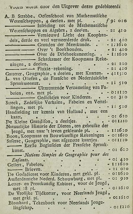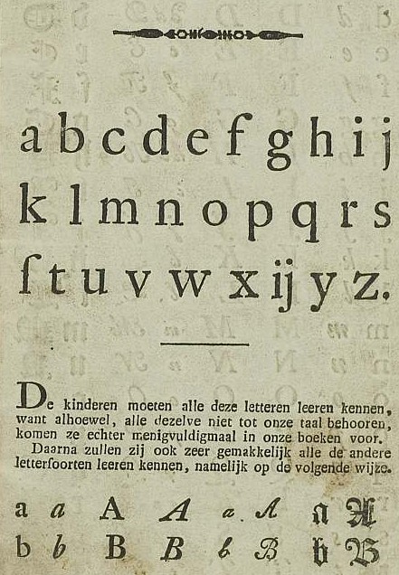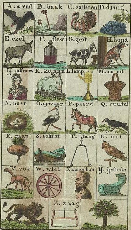Elwe, 1806. - Met gekleurde figuren.Onderwijsvernieuwing: niet alleen worden verschillende typen letters geleerd, er is ook een heus leesplankje met plaatjes bijgekomen. Interessant is verder de lijst op de laatste pagina met andere onderwijsliteratuur die de uitgever verkoopt.