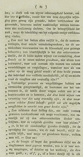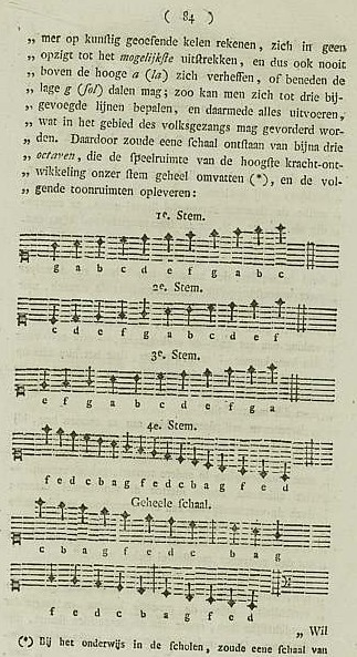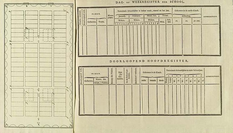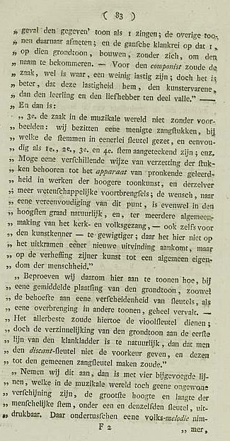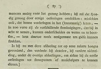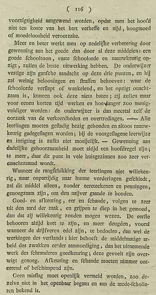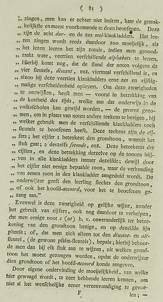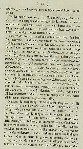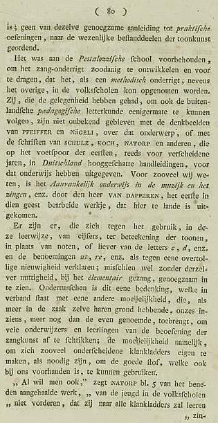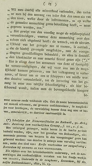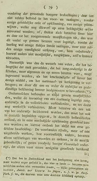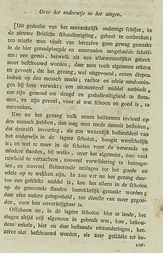 door P.K. Görlitz. - Rotterdam : May van Vollenhoven, 1820. - x, 132 p. ; 22 cmDit boek is geschreven door een onderwijzer uit Rotterdam. Hij heeft een studie gedaan naar de nieuwste onderwijsmethodieken en didactieken van zijn tijd, met name een Engelse methode (de Bell-Lancastersche leerwijze). Hij pleit voor invoering van dit model in Nederland. Er is dus in deze tijd al een hele discussie over pedagogiek op gang. Zowel het taal, lees en rekenonderwijs wordt zeer uitgebreid besproken (met voorbeeldsommen en al). Ik neem hier het hoofdstuk voor "zingen" over, omdat het de eerste pedagogische verhandeling over muziek in Nederlandse scholen is welk ik ken. De schrijver zelf meldt dat onlangs de eerste Nederlandstalige zangmethode voor scholen verschenen is, de methode van de heer van Dapperen. Hij geeft ook aan dat een beschrijving van het "zingen" in het Engelse systeem ontbreekt. De discussie die hij aanzwengelt richt zich vooral op het gebruik van een of meer sleutels, welke sleutels, en het gebruik van cijfers of noten. Hij pleit vor slechts een sleutel, en wel de discant c-sleutel. Tot slot heeft hij een heel hoofdstuk geschreven over belonen en straffen. Met name de "straffen" van het Engelse systeem lijken hem in Nederland niet te werken. Op de laatste pagina"s staan schema's over de inrichting van een school en schema's om leerlinggegevens als verzuim bij te houden. Zeer leerzaam!