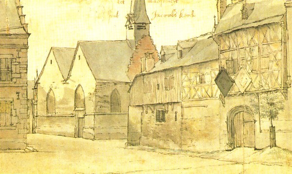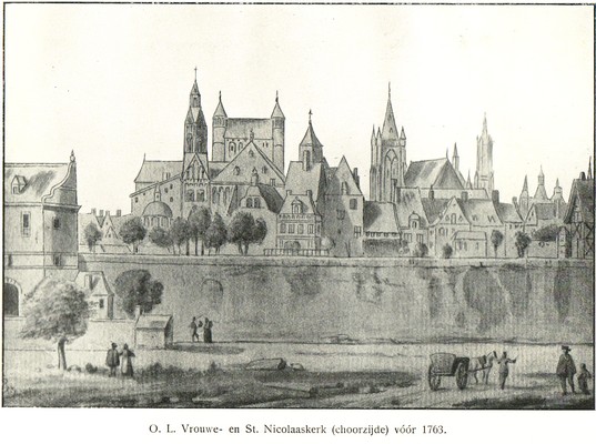 Prachtige tekening waarop de koorzijde van de OLV-basiliek te zien is. Ernaast de St. Nicolaaskerk, die ook op het OLV-plein stond en in de 19e eeuw is gesloopt. Nog meer rechts zie je nog meer silhouetten, met als meest opvallende dat van de St. Janskerk. De Pater Vincktoren was een van de onderdelen van de verdedigingsmuur. Hij is begin 20e eeuw gerenoveerd. Zo zag hij uit vlak voor de renovatie. Op de achtergrond de torens van de Helpoort. Door het zijstraatje naar rechts (Kakeberg) kun je deze tekening goed situeren. In 1287 hadden de hertogen van brabant al een huis waar schouten en rentmeesters residentie hielden: het Spaans Gouvernement. Op deze tekening zie je rechts dit gouvernement, links de Jacobskerk. Deze kerk deed dienst als parochiekerk vanaf 1632 toen de St. Jan aan de protestanten werd toegewezen door Frederik Hendrik Een tekening met een vergelijkbare opzet als de vorige. Nu zie je de Jacobskerk een beetje door de bomen heen, je ziet links het Servaas Gasthuis, waar ook een kapel aan verbonden was. Elke kapittelkerk had in principe ook een gasthuis Een van de weinige afbeeldingen waar de kerk van het Wittevrouwenklooster goed te zien is. Vrijthof Noord, waar nu o.a. Theater aan het Vrijthof is gevestigd. Mooi is hier te zien hoe het hele vrijthof feitelijk een soort park was. Je ziet weer de kapel van het Servaasgasthuis. De toren in het midden lijkt die van de St. Joriskerk aan de Grote Staat. Tekeningen van van Gulpen, meestal rond 1850