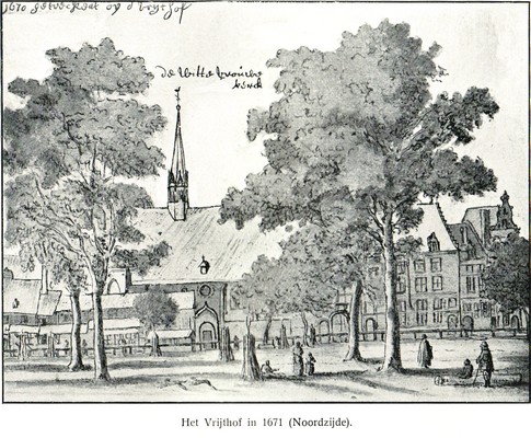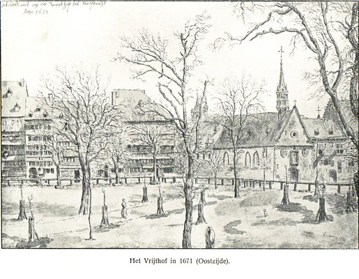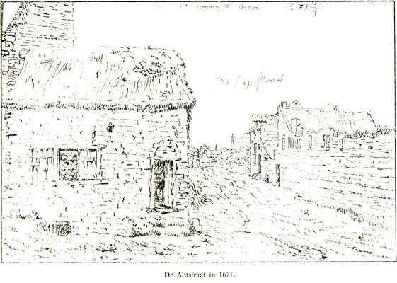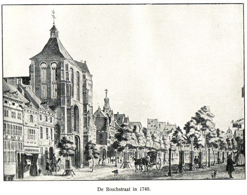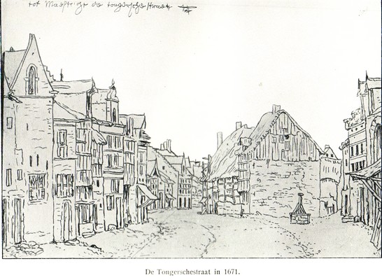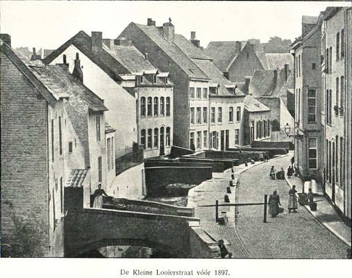Op deze tekening zie je de Matthiaskerk vanuit de Bosstraat richting Markt. Op oude plattegronden zie je heel duidelijk hoe in de Grote Looierstraat een grote gracht liep. Op deze foto uit rond 1900 kun je hier nog iets van zien. In 1903 zijn de grachten gedempt. Ook door de kleine Looierstraat liep vroeger water. Hieronder fragment kaart Bleau uit 1662 met stukje Grote en kleine Looierstraat.