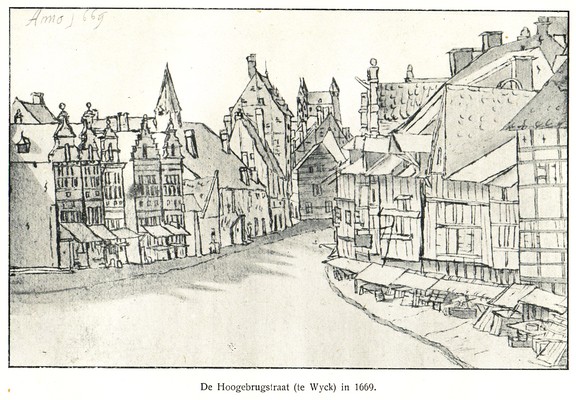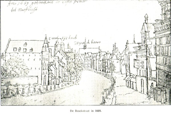 De Hooge Brugstraat in Wijck was een belangrijke straat. Hij kwam uit bij de Hoochbrugpoort, ook wel Duitse poort genoemd. Dat was de belangrijkste poort naar het achterland Keulen, Aken, Gulick, Roermond, Venlo. In de straat was ook een refugie van de proostdij van Meerssen. Verder was er nog een gasthuis voor ouden van dagen, met daaraan verbonden een kapel. Deze kun je terugvinden op oude plattegronden. Door deze tekening krijg je vooral een indruk van ook de landelijke aspecten in bepaalde delen van de stad. Op deze tekening zie je in de verte kerk en klooster van de Penitenten. Deze lagen een heel eind in de Bosstraat gezien vanaf de Markt. De Bosstraat was zo te zien een laan, met nog vrij jonge bomen aan weerszijden van de weg.