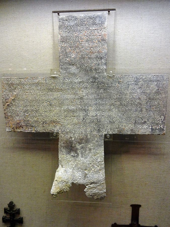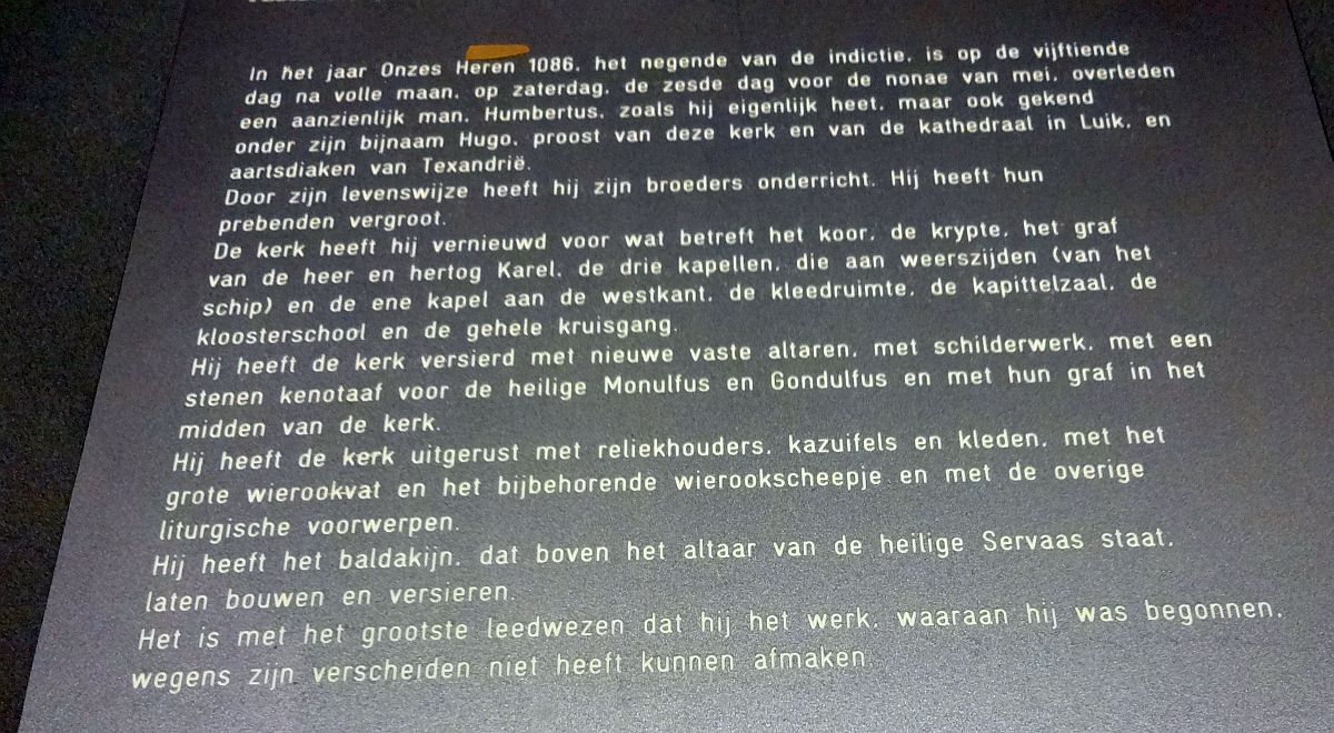 Het monument is interessant vanwege de inscriptie langs de bovenkant van de sarcofaag, die vrij uniek is en er op wijst dat de overledene enige tijd werd opgebaard. Hiertoe werd ook zijn stoffelijk overschot geteerd. Na de periode van opbaring werd zijn graf gedicht, maar niet voordat men een loden kruis in de stenen kist had geplaatst met daarop naam en sterfdatum van de overledene en al zijn goede daden. Op zich was dat niets bijzonders, ware het niet dat nergens een kruis van dergelijke grootte is gevonden, noch een opschrift dat zich qua uitvoerigheid met het Humbertuskruis kan meten."
