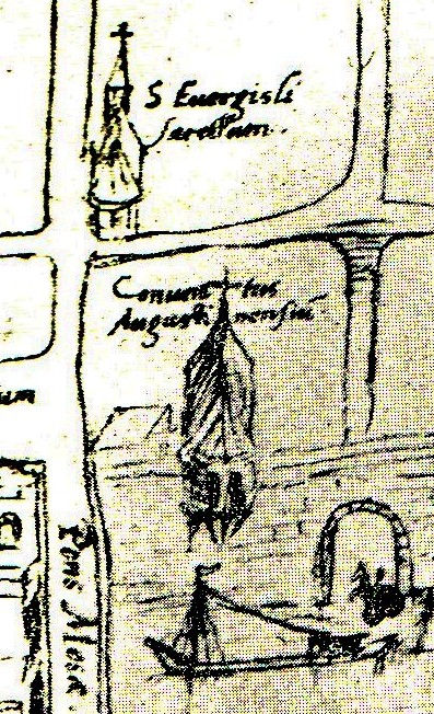 - De kerk van het H. Evangelie (S. Evangelisti). Als je de brug over was vanuit Wijck dan zag je rechts (tot omstreeks 1580) tot vlakbij het water het oude Augustijnenklooster (zie zelfde tekening). In 1621 werd verder van het water af het nieuwe gebouw neergezet, waarvan de kerk nu nog bestaat. Maar je zag gelijk iets verder op de hoek Kesselkade, Maastrichter brugstraat, de kerk van het H. Evangelie. Overigens liep vlak achter de brug naar rechts nog een lange straat, de Bokstraat. Alle huizen waren gebouwd op palen, vanwege de vele overstromingen. Bij de aanleg van het kanaal naar Luik in de 19e eeuw is de hele Bokstraat ontmanteld en alle 52 huizen zijn afgebroken.