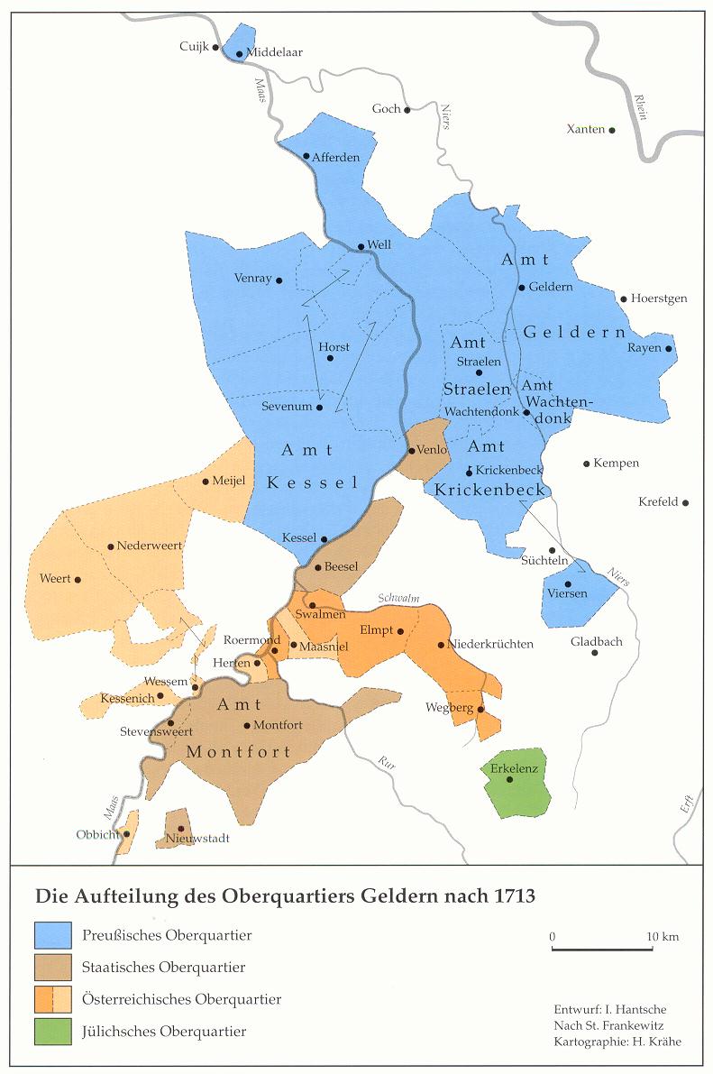 Grote delen van Midden- en Noordlimburg en het aangrenzende Duitse gebied vormen tot 1794 een staatkundige eenheid: het overkwartier van Gelder. Alleen links van de Maas ten hoogte van Roermond liggen naast enkele vrije heerlijkheden delen die behoren bij het prinsbisdom Luik en later ook Pruisische delen, rechts van de maas grenst het overkwartier aan het hertogdom Gulick, later Pruissen.