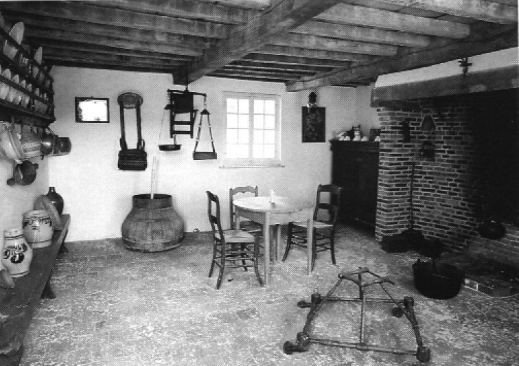 Vele stoelen waren kleine bankjes zonder leuning en stonden op drie pooten. De kachels bestonden uit zoogenaamde "steufkens" met drie pooten. De schoorsteenmantels waren van groote leufels voorzien, die ver vooruitsprongen. Daaronder brandde een hout- of een kolenvuur. In vele woningen waren de lepels op eene plank gehecht, tusschen een lederen riem, die op verscheidene punten met nagels was vastgespijkerd. Daarnaast stond de "kruikenbank" voorzien met zware steenen waterkruiken, smoutkannen, steenen "zuilen" om er bier in te tappen, bierkannen van tin, en houten of steenen melkbaren. Verder zag men er het "schotelrek" bezet met vele tinnen borden en drinkpotten, en slechts enkele borden van aardewerk of porcelein, want bij onze voorouders was het tin in groot aanzien.
