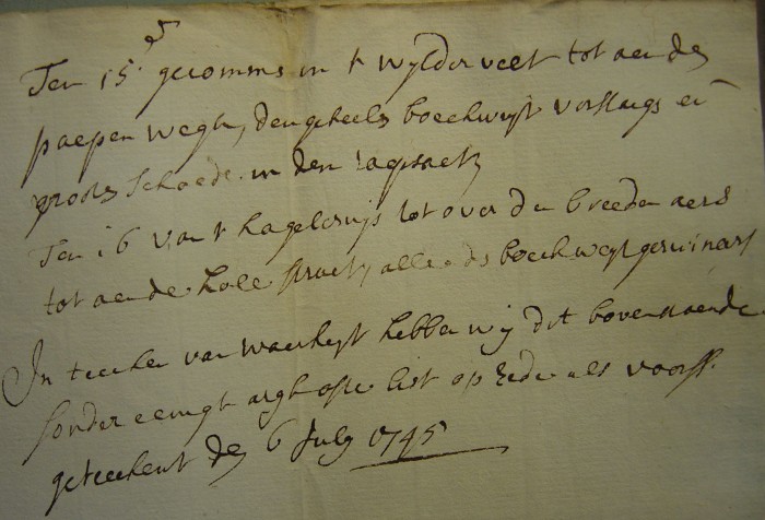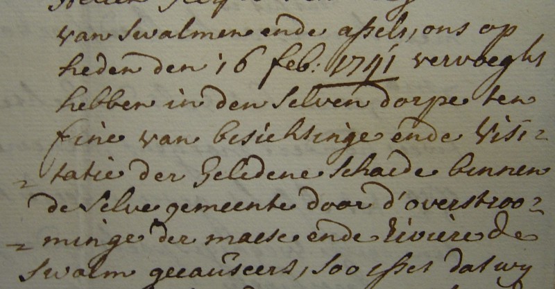 Wij ondergetekenden, schepen en borgemeester deze heerlijkheden swalmen en Asselt verklaeren ende attesteren krachtens deze op den eed in het begin van onze Resp. Officien gedaen, dat wij op verzoeck van Christiaen Cuijpers, pachter van Wijlre hof ons met den Heer I.B. Haese hebben vervoegd int veld den Ohe alwaere den voornoemde pachter ons heeft aangewezen zeven morgens den voorleden herfst met rogge ingezaaid geweest zijnde, twee morgens met wintergerst, drij morgens met spelte, twee morgens met tarwe ende twee morgen met wintersloorzaad , van waere wij op verzoek als boven zijn gegaan op het veld Den Weerd als waar gezegde pachter ons heeft aangetoond een ende een halve morgen met wintersloorzaad ende acht morgen met tarwe, voorders op den zo genoemden steenacker enen morgen met tarwe, ende twee morgen met tarwe in het wijlder veld, op welke voornoemde landerijen wij hebben bevonden de respectievelijke vruchten door de overstromingen van de riviere de Maes ende langdurig verblijf des waters teenenmaal te zijn verdronken, verteerd, ende weg gespoeld, ende deels meer als enen voet hoogh met zand ende kiezelstenen te zijn bedekt, in oirconde van Waerheidt heeft den heer scholtis beneffens ons gerichtspersonen eigenhandig geteeckend binnen Swalmen den 9 April 1784,