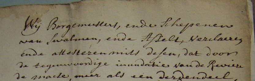 Wij borgemeesters en schepenen van Swalmen ende Asselt verklaeren en attesteren mits dezen "dat door de tegenwoordige inundatie van de reviere de Maese, meer als een derden deel deser gemeente totaelijck 14 daagen lanck onder water is geweest, ende alnoch is, waeruyt te volgen is, eenen ongemeenen schaede aen de vruchten ofte graenen op het velt, ende dat de inwoonderen daerdoor meer ende meer in de onvermoegentheydt sullen geraecken, om hunne beden ende subsidien te connen betaelen, als sijnde dese gemeynte door de voorige calamiteyt, ende diessmaels voorgevallene inundatien, soo daenigh verarmt, dat het meeste deel der inwoonderen buyten staet sijn geraeckt, van langer te connen substisteren, ende de daegelijxe executie af te wachten, requirerende daeromme den heere raedt ende landtrentmeester De Bruijne, om dese notoire waerheyden naer gedaene visitatie te bevestigen. Actum Swalmen den 20 xber 1729".