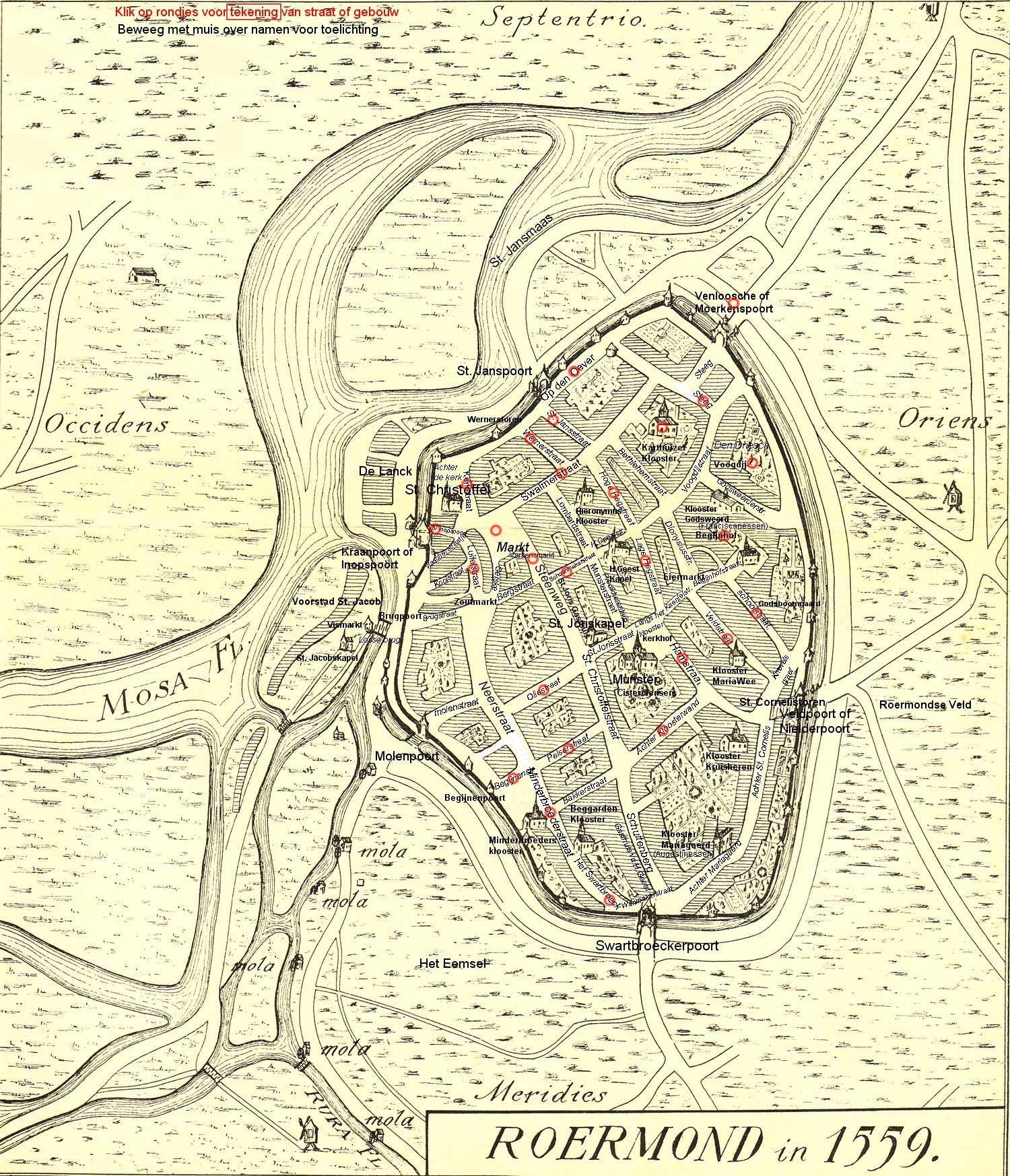 Tekeningen van Karin Deneer, Charles Hajenius en Anton Verhoeven Kraanpoort of Inopspoort. De allereerste parochiekerk bevond zich buiten de Kraanpoort (Inopspoort), terwijl de nieuwe een weinig meer Oostwaarts, net binnen de stadspoort lag. In 1410 begon men de grondslagen te leggen van het gebouw, dat nu nog dienst doet als parochiale kerk. Alle stukken bijna, die op de bouw betrekking hebben, zijn verloren gegaan, waarschijnlijk bij een van de grote branden van 1554 of 1665 Achter de Kerk. Aan de westelijke kant van de markt had men de hoofdingang van de parochiekerk en de toegang tot het kerkhof, terwijl ten N. van de kerk een doorgang was, welke naar de wal voerde Kerkstraat, een van de oudste straten Bi Inopspoort Visscherstraatje. Later St. Nicolaasstraat genoemd, waarschijnlijk naar een uithangbord Koolstraatje. In een verkoopakte van 1434, wordt gesproken wordt van een huys gelegen omtrent de Coolstraete achter de Muyre. Het was de straat waarover de kooldragers de kolen naar de markt droegen Brugstraat Brugpoort en brug over Roer. Deze oorspronkelijk losse brug voerde over de Roer en dit gedeelte van de stad, waar onder andere de Vismarkt was, heette oorspronkelijk over de Brug Voorstad St. Jacob. Naar de aan St. Jacob gewijde kapel, welke zich in dit gedeelte bevond Vismarkt en St. Jacobskapel. Deze kapel is in het begin van de tachtigjarige oorlog vernield en daarna niet meer opnieuw hersteld. Molenstraat en Molenpoort. Zij kreeg haar naam naar de molens aan de Roer, waarvan er reeds een genoemd wordt in de schenkingsbrief van Gerhard III aan de Maria-abdij. Naast de naam Molenpoort komt ook voor: Eselspoort. Luifelstraat. Deze naam kreeg de straat naar een luifel of gaanderij op de markt, (gelijk men in vele oude steden vond), zoals blijkt uit een verkoopakte, waarin gesproken wordt van een huis opten merckt onder de louwen Getske of Hanenstraatje. De enige maal, dat dit straatje in oude stukken genoemd wordt, werd het aangeduid als dat getzken, dair man achter die leuffe geit Zoutmarkt Neerstraat. De naam Neerstraat is gemakkelijk te verklaren, als men bedenkt, dat de kerk op een hoogte stond en dat de Neerstraat oorspronkelijk veel lager heeft gelegen, zoals bleek bij de rioleering van het Zuidelijk gedeelte van de stad, toen men in de Neerstraat de oude straat vond, bijna een meter lager dan de tegenwoordige. Begijnenstraat en begijnenpoort. Vlak voor het Minderbroedersklooster had men een thans verdwenen straat, de Begijnenstraat, welke uitliep op de Begijnenpoort. Deze hadden oorspronkelijk een klooster buiten de stad. Minderbroederstraat en Minderbroederklooster, in 1307 gesticht werd door Reinald I van Gelre, die hiervoor zijn curia Pott aan genoemde broeders afstond. Het Swartbroeck en Swartbroeckerpoort.Oorspronkelijk was hier slechts een slagboom, later een poort Wanmakerstraat Beggardenklooster. Gemeenschap van mannelijke begijnen. Schuitenberg. Deze straat liep evenwijdig met het Swartbroek. De naam Schuitenberg is niet geheel met zekerheid te verklaren. Waar nu nog in de vorige eeuw bij hoog water het verkeer door de Neerstraat alleen mogelijk was per schuit, is het niet te verwonderen, dat vroeger, toen, zoals we zagen, de Neerstraat nog aanmerkelijk lager was gelegen, de straat, die blijkens het tweede Lid, berg, hoger lag, bij hoog water zeer geschikt was, om dienst te doen als aanlegplaats voor de schuitjes, die het verkeer onderhielden. Bakkerstraat. De verbinding tussen de Schuitenberg en de Minderbroederstraat werd gevormd door de Bakkerstraat. Deze naam, welke ook voorkomt als Beckerstraet, is door verbastering ontstaan uit Beggardenstraat. De straat heette oorspronkelijk Vollerstraat, maar werd na het stichten van het klooster van de Beggarden of mannelijke begijnen, dat reeds in 1322 vermeld wordt, hiernaar vernoemd. Gasthuis H. Geest. Op de Schuitenberg werd in de 15e eeuw, krachtens het testament van Johan Pollart, een gasthuis gesticht welke liefdadigheidsinstelling ten dele onder stedelijk toezicht kwam Christoffelstraat Pelserstraat. Blijkens de in het archief van Roermond aanwezige amptsbrief van de pelsers, moest men bij deze naam niet alleen denken aan pelterijen, daar dit bedrijf ook omvatte het ingelden en wedervercopen van schaepfellen, Deck die selve plucken ofte bloeten wie insgelijcken vossen flouwijnen coninxvellen ende dergelijcke Oliestraat St. Joriskapel en St. Jorisgasthuis. Een van de oudste gebouwen van de stad, daar in 1259 Alexander IV op verzoek van de hospitaalbroeders van de H. Geest, een aflaat van 40 dagen verleende aan alle personen, welke bijdroegen tot voltrekking van het hospitaal Steenweg. Volgens Sivré lagen langs deze weg de stenen, die gebruikt werden voor de onderbouw van de Munsterabdij, of werden zij hierlangs vervoerd Bergstraat. Van de Steenweg voerde de Bergstraat met een steile helling (vandaar de naam) naar de Neerstraat. Varkensmarkt Markt. Met stadhuis, gewandhuis (lakenhal), vleeschhuis enz. Swalmerstraat. Van hieruit liep de weg naar Swalmen. De naam Swalmerstraat is wellicht ook genoemd naar Werner van Swalmen, kruisvaarder uit de 14e eeuw, die onder andere de abdij van de karthuizers stichtte. Wernerstraat en Wernertoren. Behalve in de namen Swalmerstraat en Bethleemstraat leeft de herinnering aan Werner van Swalmen nog voort in de Wernerstraat, die van de Swalmerstraat links naar de wal voerde en uitliep op de Wernerstoren St. Jansstraat en St. Janspoort. Evenwijdig aan de Wernerstraat liep de St. Jansstraat, waardoor men bij de St. Janspoort kwam. Op den Oever. Dit gedeelte strekte zich uit van de parochiekerk tot aan de Venloosche- of Moerkenspoort, en ontleende zijn naam aan de omstandigheid, dat het de hooggelegen oever vormde van de arm van de Maas, die, om welke redenen is onbekend, de St. Jans Maas heette. Lombardstraat of Hieronymusstraat. Zo genoemd naar de Lombarden uit het bekende geslacht de Montefija Schoenmakerstraat. In deze Schoenmakerstraat lag o. a. het grote steenen huis van Johan v