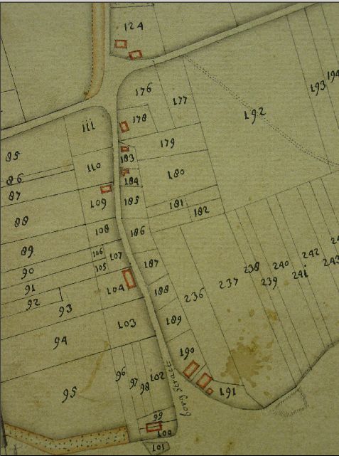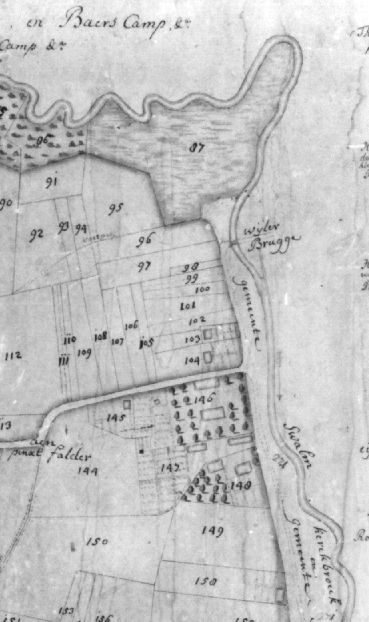 Behalve een huis zien we dat de echtelieden een aantal stukken land verkrijgen. De plaats van dat huis, Smabers B1-113 is vrijwel exact te bepalen. De huizen die er nu staan zijn allemaal nog niet zo oud, het originele huis is dus ooit afgebroken. Rijkel blijft enkele generaties het gebied waar de familie Simons zich het meeste ophoudt. Dat huis, Smabers 1-113 doet de oude Simons vlak voor zijn dood over aan zijn schoonzoon Wilhelmus Beckers, die getrouwd was met zijn dochter Theodora Simons. Een broer van Theodora is Johannes, en dat is de volgende stamvader in lijn. Deze zoon Johannes koopt een ander huis in Rijkel, vlakbij dat van zijn vader (en daarna dus dat van zijn zus, Smabers 1-104). Beide huizen liggen ook niet zo ver van de Einderhof en zijn feitelijk samen met de Einderhof lokaties waar dus voorouders van mij gewoond hebben. Op de Smaberskaart kunnen al deze huizen goed gelokaliseerd worden. Het tweede huis is erg duidelijk te zien op een prachtige kleurenkopie van een fragment van deze originele Smaberskaart die Loe Giesen me gestuurd heeft. Het gaat om het huis in Rijkel aangeduid met nummer 104. Het eerste huis aan de linkerkant van de weg op foto hierboven komt overeen met de plaats van Smabers 1-104, dus waar ooit het huis van Joannes Simons junior stond.