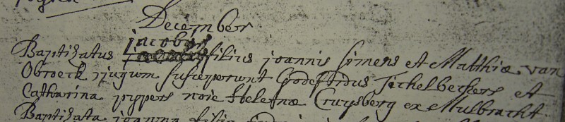 - Een getuige bij de doop van de eerstgeboren zoon van Joannes Simes in Beesel is Helena Cruijsberg uit MulBracht (= Bracht). Dit is voor mij de sterkste aanwijzing dat Joannes Simes uit Bracht kwam en daarmee identiek is aan Johann Simons uit Bracht, geboren in 1693. Drie aanwijzingen op rij, alle drie erg sterk, maakt de waarschijnlijkheid behoorlijk groot!