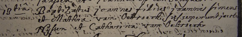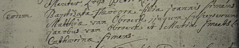 - Bij de zus Cornelia van deze Johann zien we als getuige Catharina Simons. (Dit zou zowel de grootmoeder van Johann uit Bracht kunnen zijn als zijn zus Catharina uit bracht.) We zien bij Joannes Simes uit Beesel twee keer de naam Catharina verschijnen. Bij de oudste dochter Theodora van Joannes Simes uit Beesel zien we als doopgetuigen Jacobus van Obroeck en Maria Smeets, voor Catharina Simens. Catharina Simens wordt vervangen. Waarom? Ik denk omdat ze in Bracht woont, dat is te ver. Waarschijnlijk de zus van Joannes. Nog een reden dat het kan kloppen!