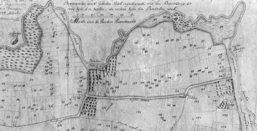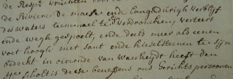 Wij ondergetekenden, schepen en borgemeester deze heerlijkheden swalmen en Asselt verklaeren ende attesteren krachtens deze op den eed in het begin van onze Resp. Officien gedaen, dat wij op verzoeck van Christiaen Cuijpers, pachter van Wijlre hof ons met den Heer I.B. Haese hebben vervoegd int veld den Ohe alwaere den voornoemde pachter ons heeft aangewezen zeven morgens den voorleden herfst met rogge ingezaaid geweest zijnde, twee morgens met wintergerst, drij morgens met spelte, twee morgens met tarwe ende twee morgen met wintersloorzaad , van waere wij op verzoek als boven zijn gegaan op het veld Den Weerd als waar gezegde pachter ons heeft aangetoond een ende een halve morgen met wintersloorzaad ende acht morgen met tarwe, voorders op den zo genoemden steenacker enen morgen met tarwe, ende twee morgen met tarwe in het wijlder veld, op welke voornoemde landerijen wij hebben bevonden de respectievelijke vruchten door de overstromingen van de riviere de Maes ende langdurig verblijf des waters teenenmaal te zijn verdronken, verteerd, ende weg gespoeld, ende deels meer als enen voet hoogh met zand ende kiezelstenen te zijn bedekt, in oirconde van Waerheidt heeft den heer scholtis deese beneffens ons gerichtspersonen eigenhandig geteeckend binnen Swalmen den 9 April 1784,