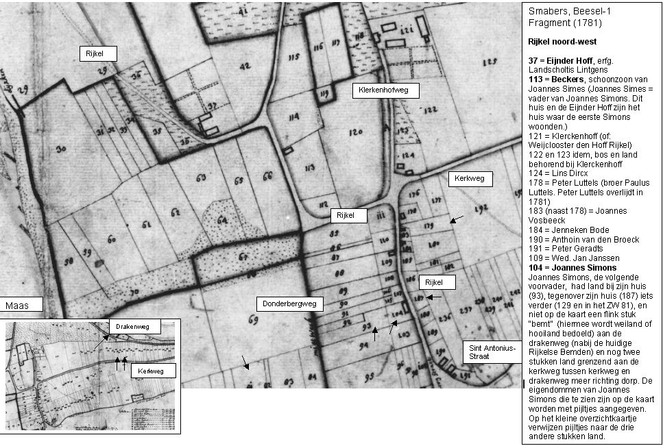 Joannes Simons (1726-1784). Van hem weten we precies wat hij bezat, dank zij het feit dat hij genoemd wordt op de Smaberskaarten en daar kun je niet alleen zien waar hij woonde, maar ook welke grond hij bezat. De meeste grond had hij vlak bij zijn huis, zie de pijltjes op het fragment van de Smaberskaart (Rijkel NW). Op deze kaart zie je ook de liggingen van de huizen van Simes Sr. (Joannes Simes en Tisken van Obroeck), nl. 113, waar op dat moment hun dochter Theodora en man Wilhelmus Beckers woont. Ook de Eijnderhoff, waar Joannes Simes als pachter begonnen is, staat er op. Maar Joannes had nog veel meer grond, het meeste ten zuiden van zijn huis, zie Smabers-Rijkel-ZO. Deze twee kaarten van Rijkel vertellen ons niet alleen dat hij veel en veel soorten grond bezat (drie knechten had zijn vader, wat zou hij gehad hebben?), maar ook wie zijn buren waren. En daar waren nogal wat familieleden of toekomstige familieleden bij. Logisch, want die mensen zag je dagelijks. Op de kaart van Rijkel ZO zien we bijv. het huis van Joannes Trippen. Joannes Trippen was de schoonzoon van Joannes Simons, hij was op 27-4-1774 getrouwd met zijn dochter Catharina Simons.