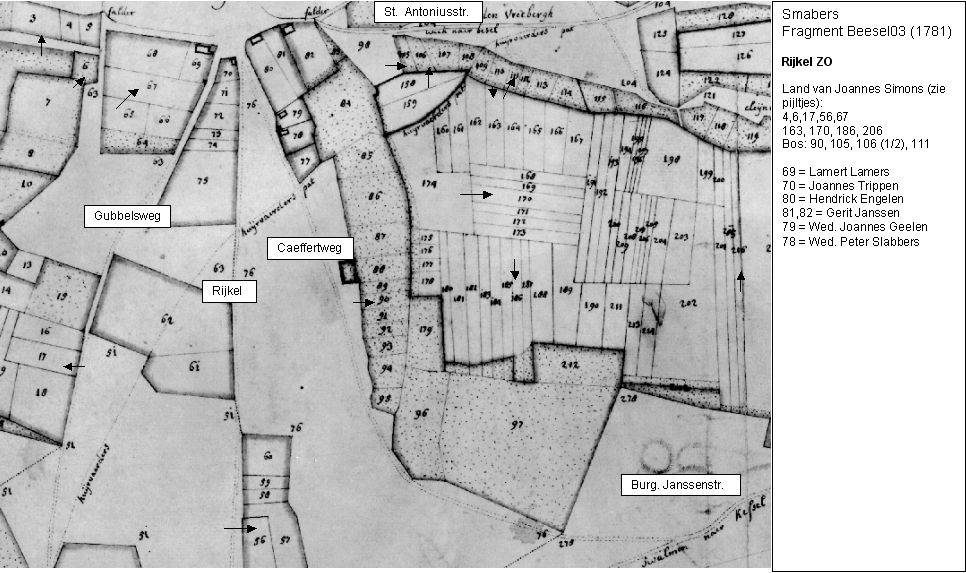 Een ander familielid is op de Smaberskaart nr. 80, Hendrick Engelen. Op dit moment vermoed ik dat het om een broer gaat van zijn vrouw Gertrudis Engelen. Op de kaart van Rijkel NW, waar ook het huis van Joannes Simons staat zien we nog als buren: 178, Peter Luttels. Peter Luttels is de broer van Paulus Luttels. Paulus Luttels is de grootvader van Jacoba Luttels, die in 1834 met Antonius Simons trouwt, een achterkleinzoon van onze Joannes Simons. Zo is de familie Luttels dus ook een van de takken van mijn voorgeslacht. Uit de Smaberskaarten blijken nog andere connecties. In oostBeesel ligt ook een stuk land van Joannes Simons. Maar dat ligt erg onhandig ver van zijn woning. Hoe komt hij daar aan? Het gaat om Smabers-B 7-52. Dat stuk land is verdeeld onder erffg. Engel Hinssen 1/3, Anthoin van den Broeck 1/3 en Joannes Simons 1/3. Anthoin vd. Broeck treffen we ook aan op de kaart van Rijkel NW (190),(Smabers 1) het is een overbuurman van Joannes Simons. Anthoin vd Broeck trouwt 28 april 1748 met Catharina Engelen, dochter van Petrus Engelen en Margaretha Clerx. Zij zijn dus zwagers van elkaar, en het erfdeel in het oosten komt dus waarschijnlijk van de familie Engelen. Maar wat heeft Engel Hinssen daar mee te maken? Wel, we zien een aantal keren in de 18e eeuw een Hinssen getuige zijn bij een doop of huwelijk van van den Broeck of Engelen. Joanna Hinssen, geboren 23 juni 1716 in Belfeld en overleden 14 september 1787 in Belfeld had als moeder Mechtildis Clerx. Ik vermoed dat Mechtildis en Margaretha Clerx zussen waren, en in dat geval is ook dit erf-raadsel weer opgelost.