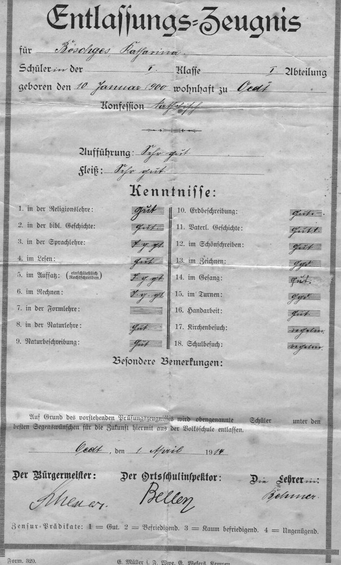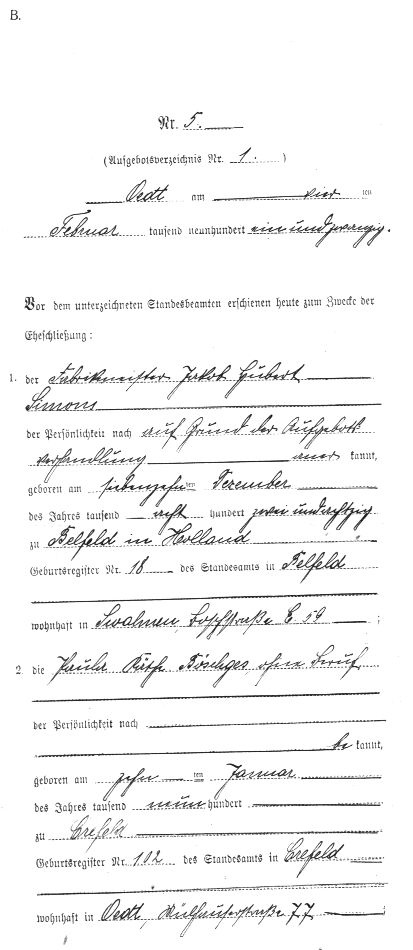 Huwelijksakte Jacobus + Catharina.Uit de geboorte-akte van mijn oma blijkt dat haar moeder van Keeken heet. Na enig naspeuren ben ik er achter gekomen dat mijn moeder (haar moeder heet ook van Keeken) in de vierde graad bloedverwant is met mijn vader. Zie daarvoor het grafische overzicht van de stamboom waar uitsluitend directe bloedverwanten vermeld worden. Haar vader Johann Böschges is nog een grote onbekende. Bij de geboorteakte van mijn oma kun je lezen dat hij uit Krefeld kwam. Via het archief in Brühl bij Köln of op andere plaatsen in Duitsland moet meer informatie te vinden zijn. De naam Böschges bestaat overigens in Duitsland vrijwel niet, er zijn slechts enkele families te vinden: in Grefrath (bij Oedt)en omgeving!! Misschien is de naam Böschges een verbastering die eind 19e eeuw is ontstaan en was de originele naam bijv. Buschges of Büschges. Dat moet allemaal nog onderzocht worden. Wordt vervolgd!