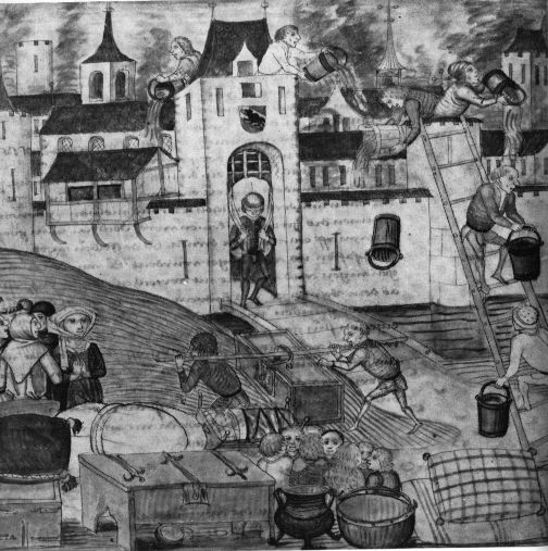 Nijmegen zond 100 Ridderguldens en Gelder 5 wagens met levensmiddelen. Volgens Drs.J.G.C.Venner telde Roermond ongeveer 1300 huizen waarvan er omstreeks 950 afbrandden. Fragment uit een brief van de Magistraat van Roermond aan het Hof. Vrijdag 20 juli 1554. "… Afbeelding met daarop bluswerkzaamheden in een Middeleeuwse stad, uit: "Amtlicher Berener Chronik" van D. Schilling. Bürgerbibliothek, Bern