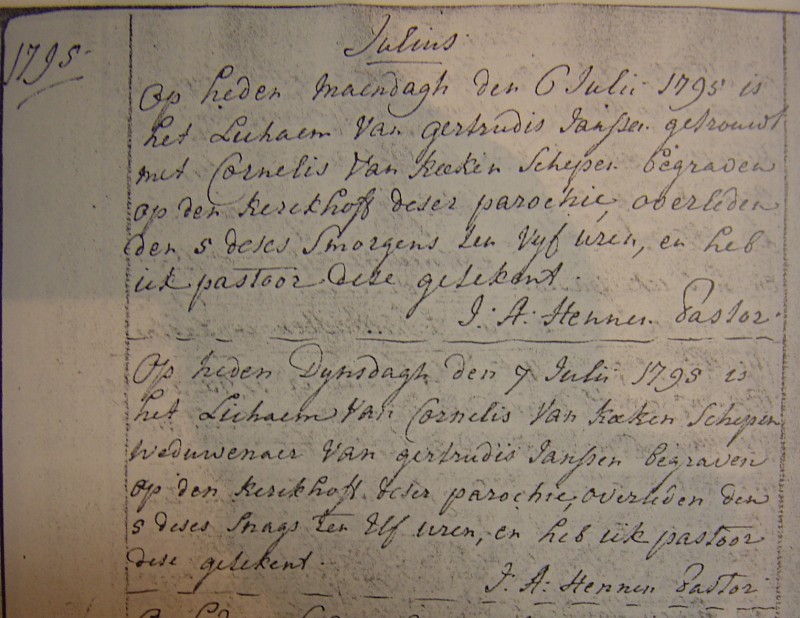 DTB-registers St.-Lambertusparochie Swalmen 126.7, fol. 29.zondag 5 juli 1795. SWALMEN - Overleden om 23.00 uur: Cornelis van Keeken, schepen, weduwnaar van Gertrudis Janssen [geh. Maasniel 2-5-1767, overl. Swalmen 5-7-1795]; begr. ald. 7 d.a.v.